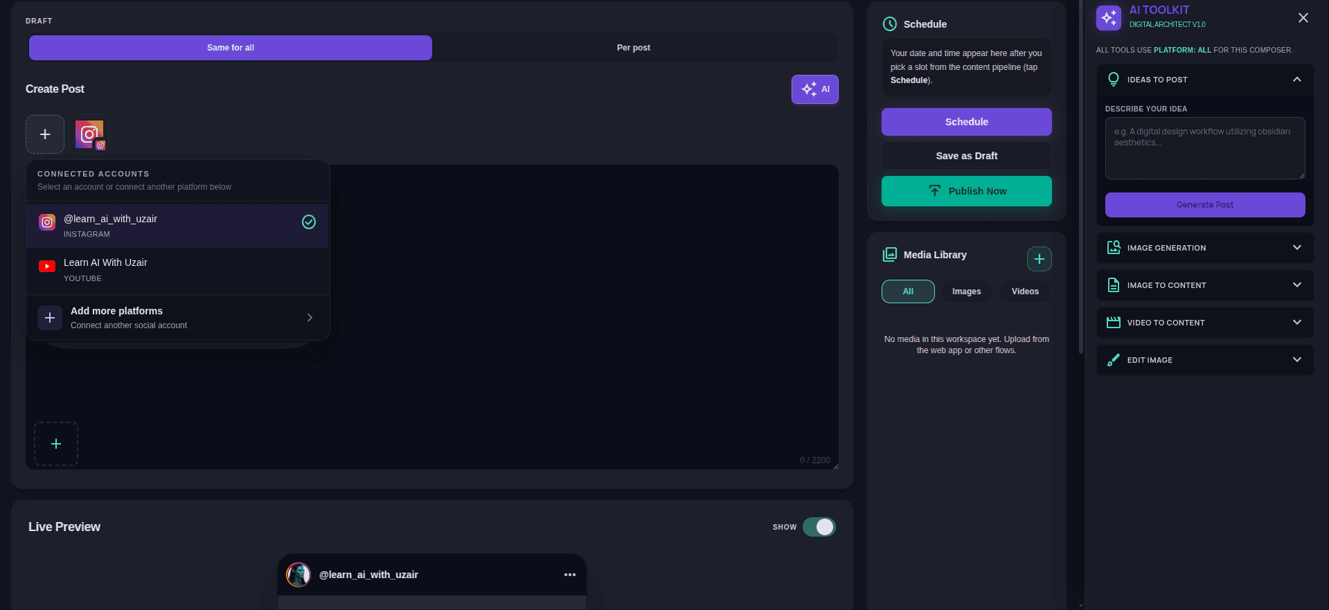 Start from one draft, then tune copy and layout per channel. Live previews show what each network will render—no screenshot ping-pong.
