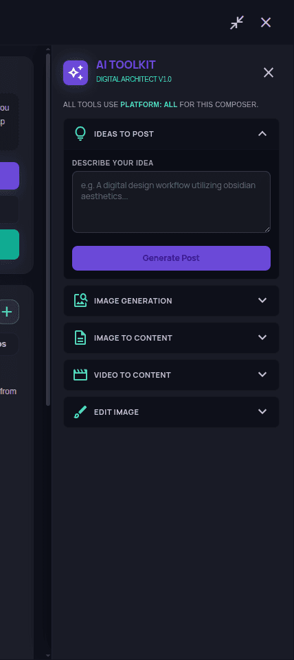Ideas, image gen, video-to-content, locked to your persona.