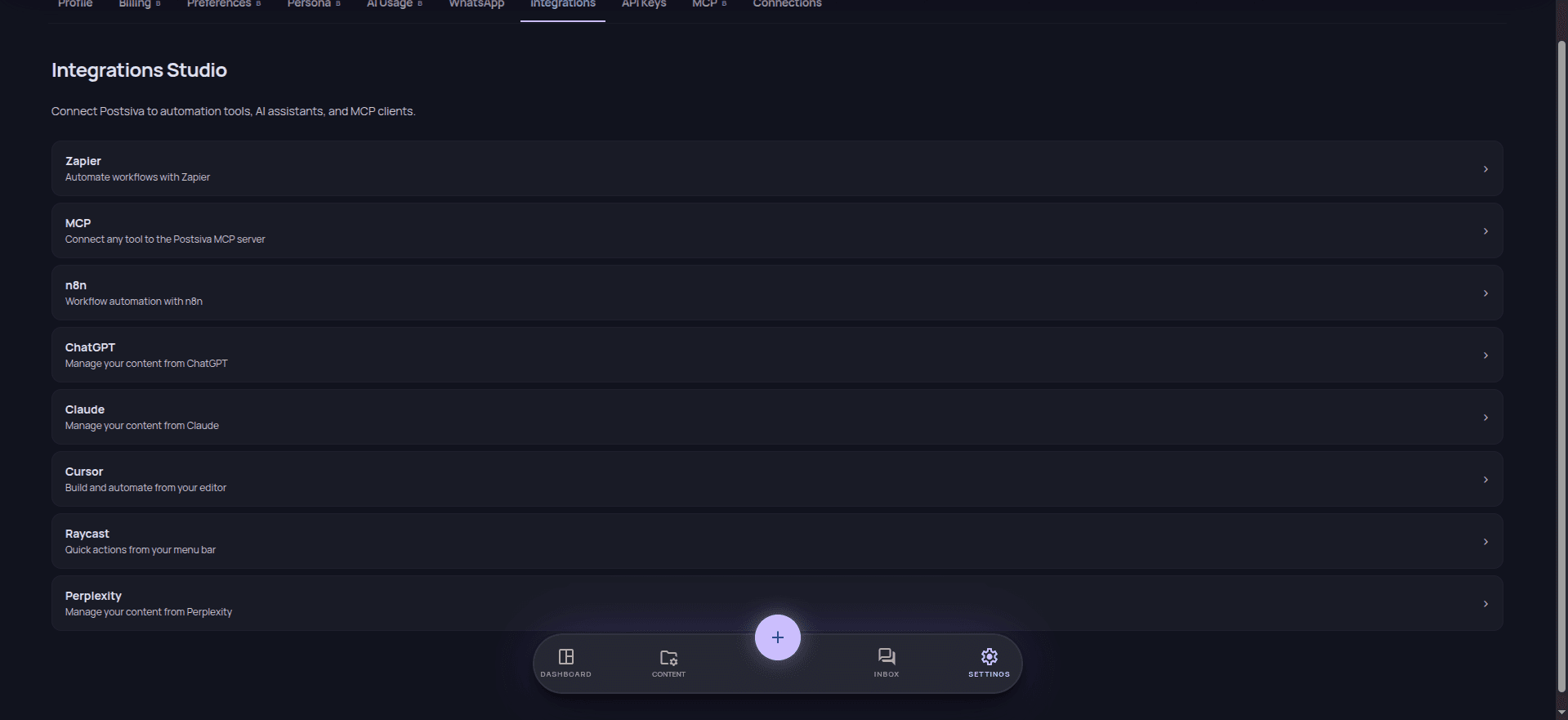 The same structure you love from Postsiva — now unified: LinkedIn beside Facebook, Reels next to TikTok drafts, WhatsApp nudges, mobile, ChatGPT, and MCP when you need them.